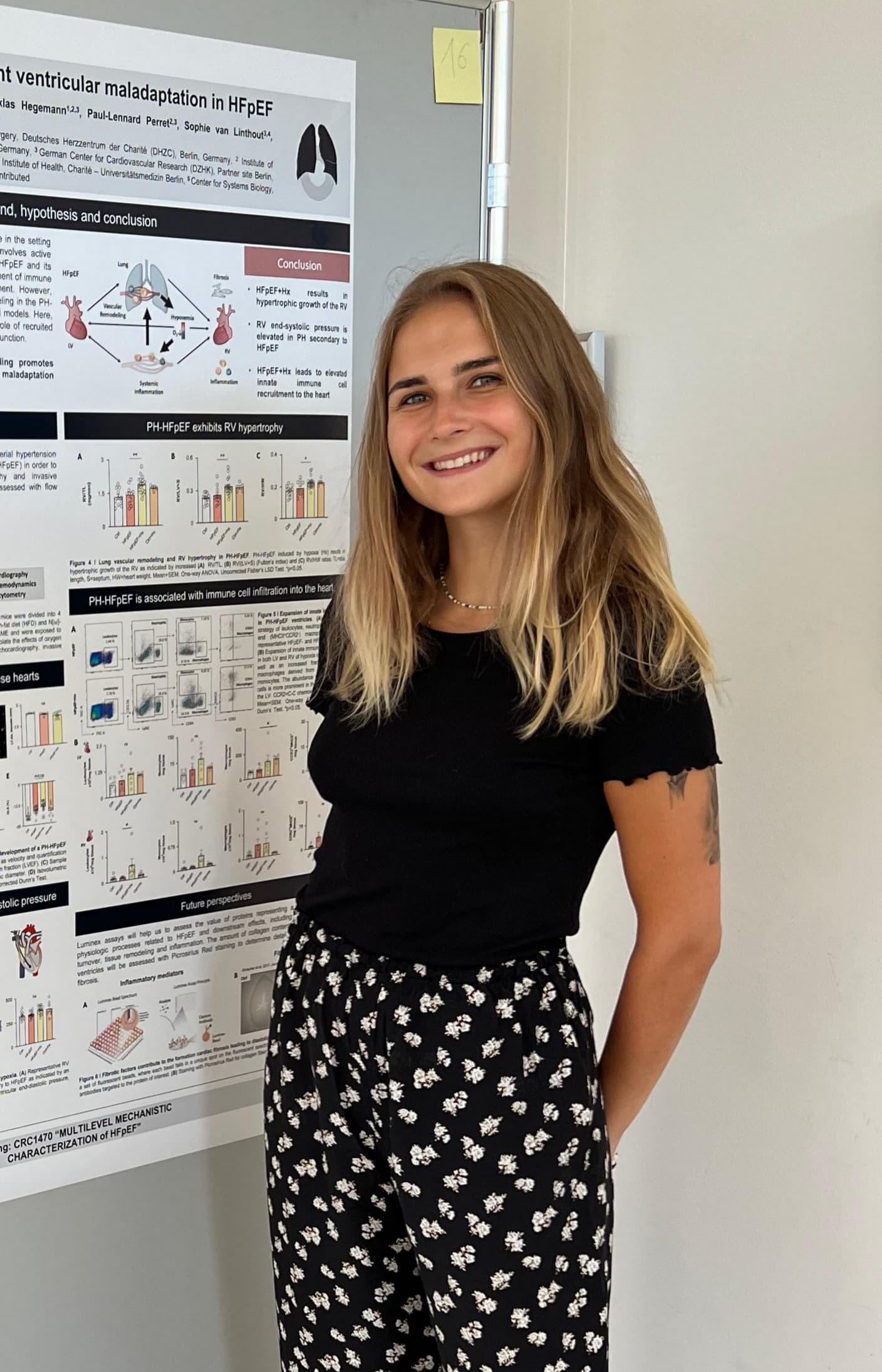 Heart failure with preserved ejection fraction (HFpEF) is frequently complicated by right ventricular (RV) dysfunction, which is associated with poor outcomes but remains mechanistically unclear. The PhD student Lara Jaeschke (Grune Lab, Campus Mitte) developed a new HFpEF mouse model with secondary pulmonary hypertension and right ventricular maladaptation to investigate the role of innate immune cells in the disease pathology. Using the mouse model and patient biopsies, Lara Jaeschke demonstrated that macrophage recruitment and accumulation and neutrophil expansion drive the release of pro-fibrotic and pro-inflammatory mediators, leading to fibrosis, RV hypertrophy, and dysfunction. Importantly, macrophage depletion rescued RV function and normalized inflammatory and fibrotic gene expression, establishing myeloid cells as causal drivers of RV pathology in HFpEF and highlighting them as potential therapeutic targets.